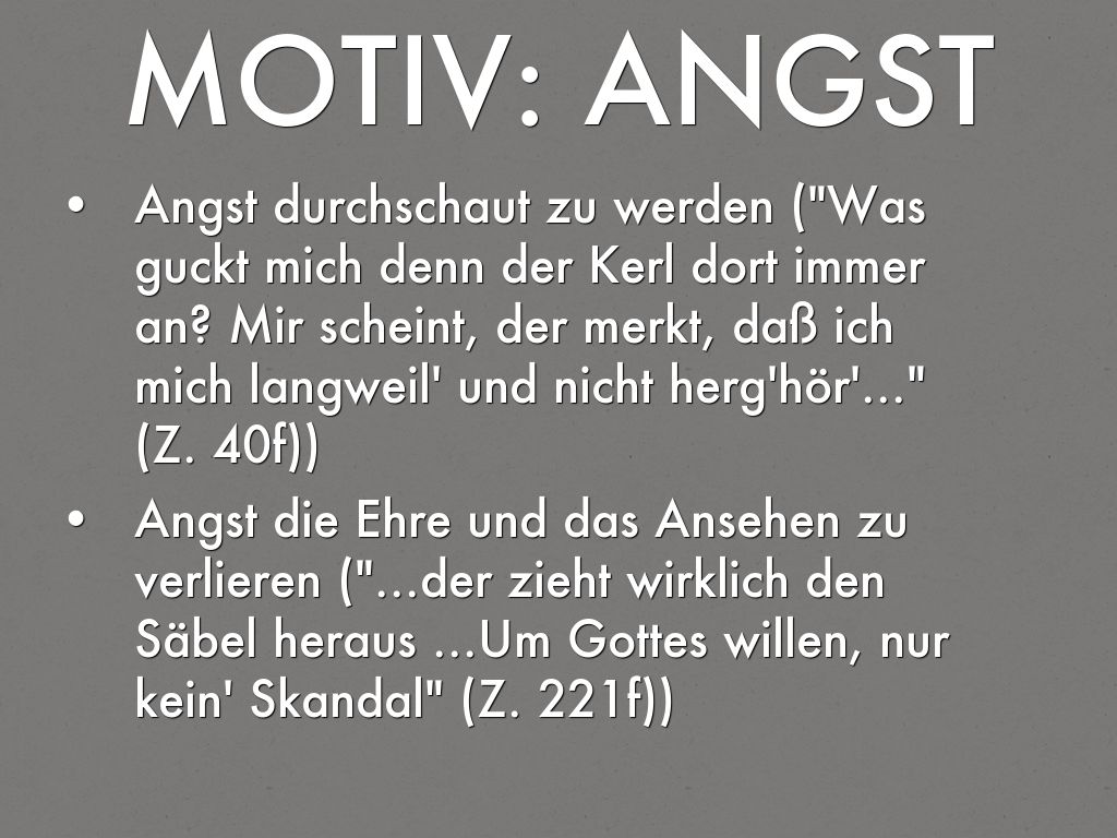 - Angst die Ehre und das Ansehen zu verlieren ("...der zieht wirklich den Säbel heraus ...Um Gottes willen, nur kein' Skandal" (Z. 221f))