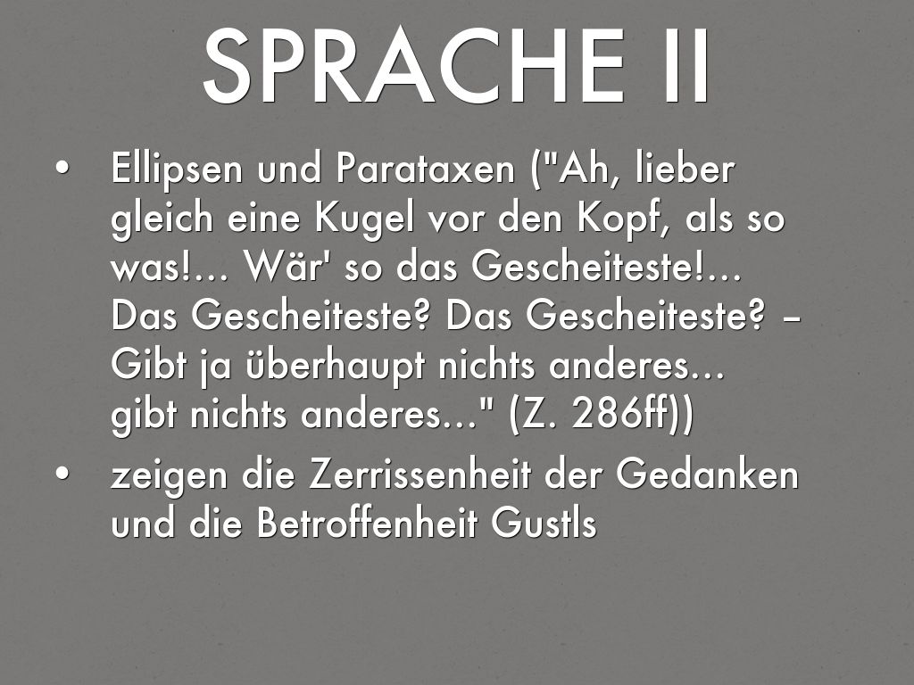 - Ellipsen und Parataxen ("Ah, lieber gleich eine Kugel vor den Kopf, als so was!... Wär' so das Gescheiteste!... Das Gescheiteste? Das Gescheiteste? – Gibt ja überhaupt nichts anderes... gibt nichts anderes..." (Z. 286ff))