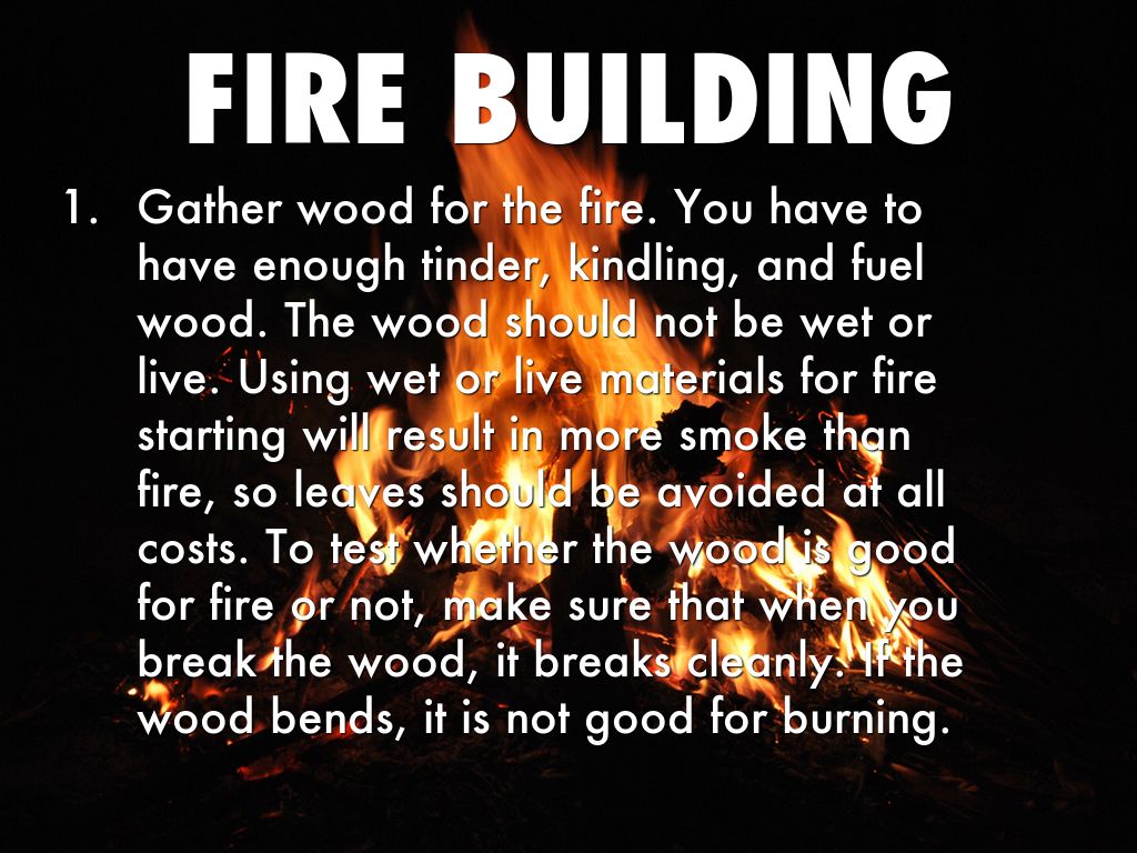 • Gather wood for the fire. You have to have enough tinder, kindling, and fuel wood. The wood should not be wet or live. Using wet or live materials for fire starting will result in more smoke than fire, so leaves should be avoided at all costs. To test whether the wood is good for fire or not, make sure that when you break the wood, it breaks cleanly. If the wood bends, it is not good for burning.