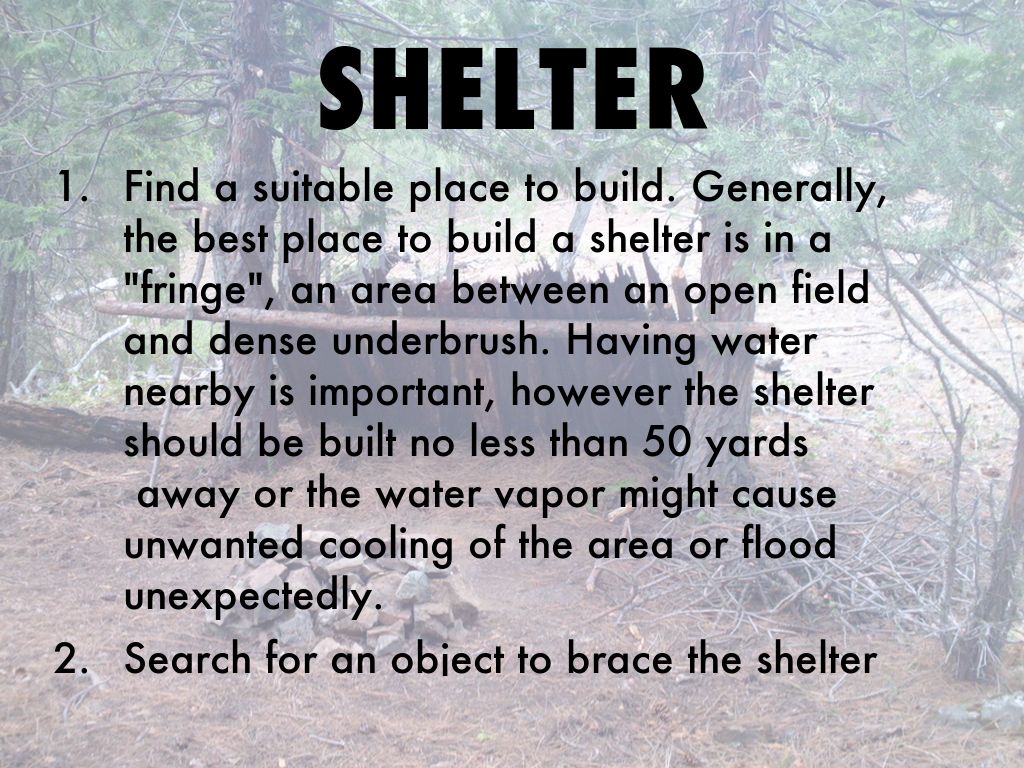 • Find a suitable place to build. Generally, the best place to build a shelter is in a "fringe", an area between an open field and dense underbrush. Having water nearby is important, however the shelter should be built no less than 50 yards away or the water vapor might cause unwanted cooling of the area or flood unexpectedly.