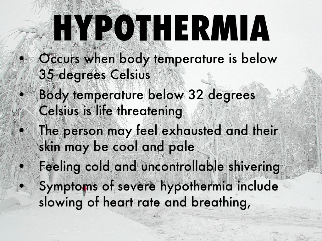 • Symptoms of severe hypothermia include slowing of heart rate and breathing, dilated pupils, and coma