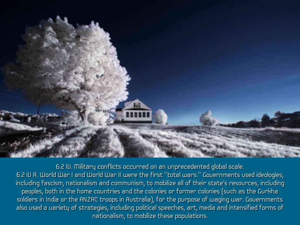 6.2 IV A. World War I and World War II were the first “total wars.” Governments used ideologies, including fascism, nationalism and communism, to mobilize all of their state’s resources, including peoples, both in the home countries and the colonies or former colonies (such as the Gurkha soldiers in India or the ANZAC troops in Australia), for the purpose of waging war. Governments also used a variety of strategies, including political speeches, art, media and intensified forms of nationalism, to mobilize these populations.