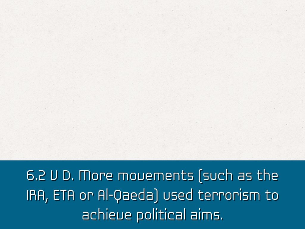 6.2 V D. More movements (such as the IRA, ETA or Al-Qaeda) used terrorism to achieve political aims.