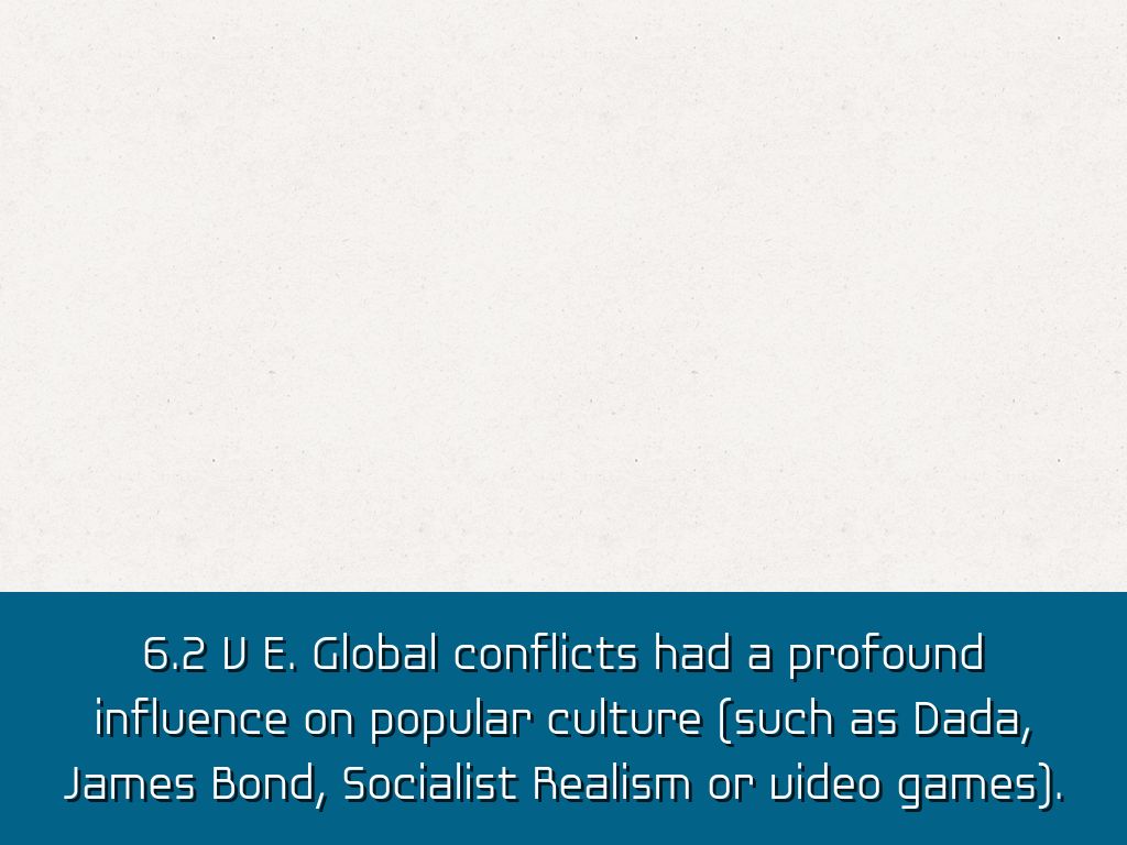 6.2 V E. Global conflicts had a profound influence on popular culture (such as Dada, James Bond, Socialist Realism or video games).