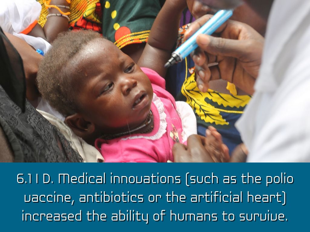 6.1 I D. Medical innovations (such as the polio vaccine, antibiotics or the artificial heart) increased the ability of humans to survive.