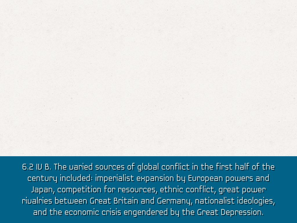 6.2 IV B. The varied sources of global conflict in the first half of the century included: imperialist expansion by European powers and Japan, competition for resources, ethnic conflict, great power rivalries between Great Britain and Germany, nationalist ideologies, and the economic crisis engendered by the Great Depression.