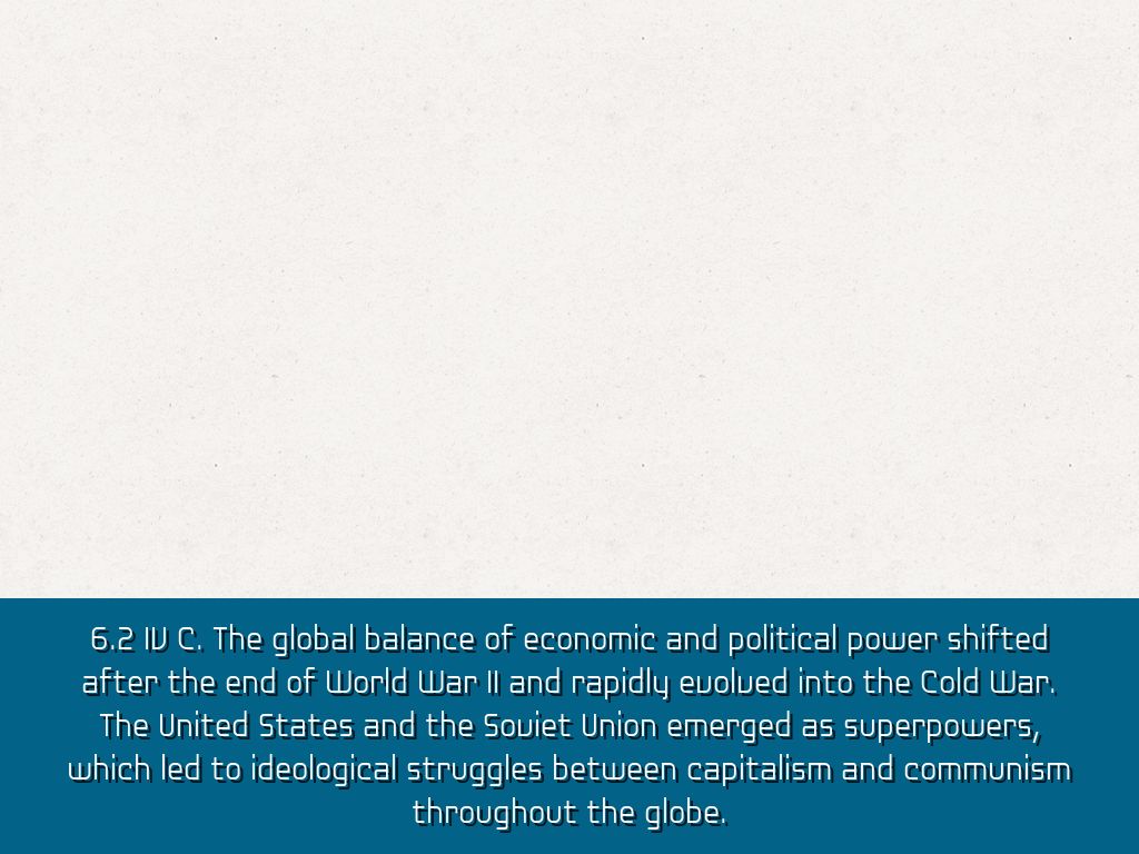 6.2 IV C. The global balance of economic and political power shifted after the end of World War II and rapidly evolved into the Cold War. The United States and the Soviet Union emerged as superpowers, which led to ideological struggles between capitalism and communism throughout the globe.