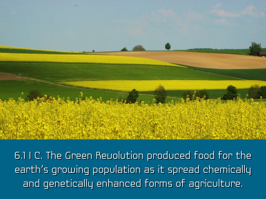 6.1 I C. The Green Revolution produced food for the earth’s growing population as it spread chemically and genetically enhanced forms of agriculture.