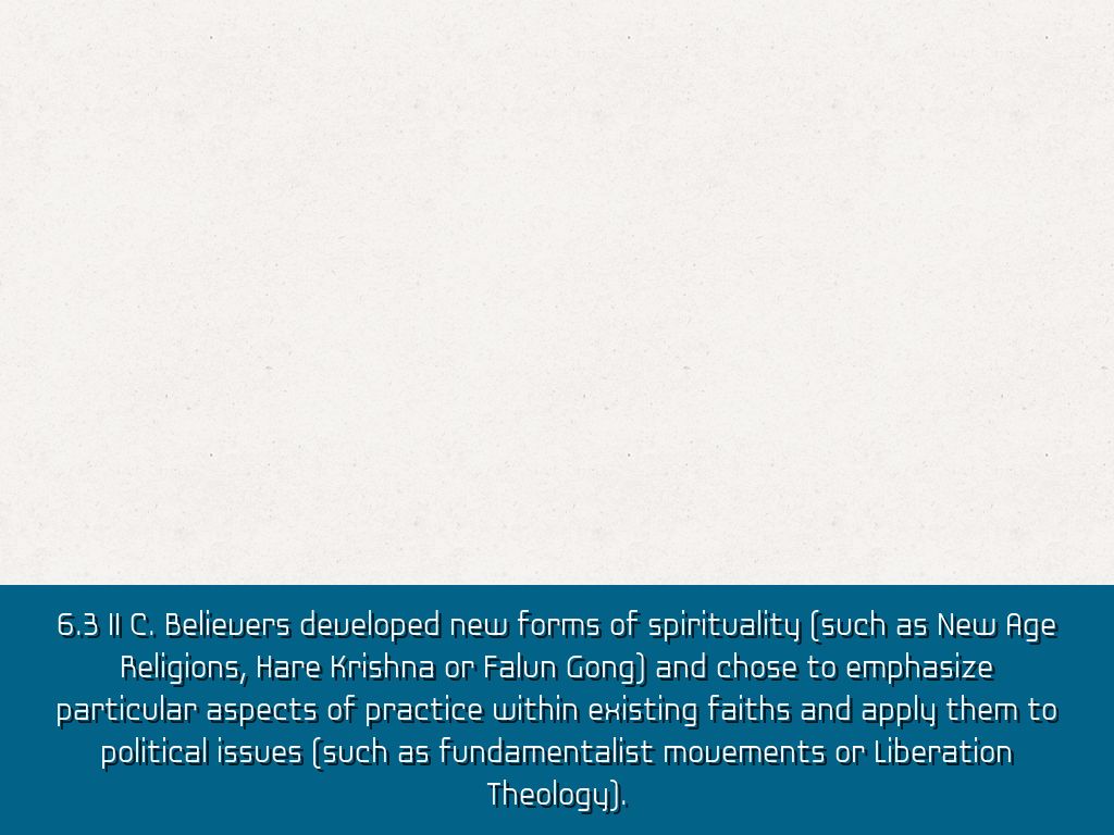6.3 II C. Believers developed new forms of spirituality (such as New Age Religions, Hare Krishna or Falun Gong) and chose to emphasize particular aspects of practice within existing faiths and apply them to political issues (such as fundamentalist movements or Liberation Theology).