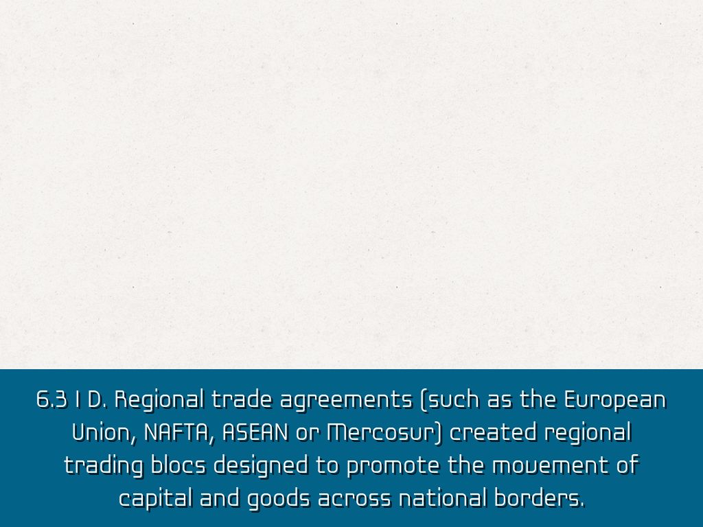 6.3 I D. Regional trade agreements (such as the European Union, NAFTA, ASEAN or Mercosur) created regional trading blocs designed to promote the movement of capital and goods across national borders.
