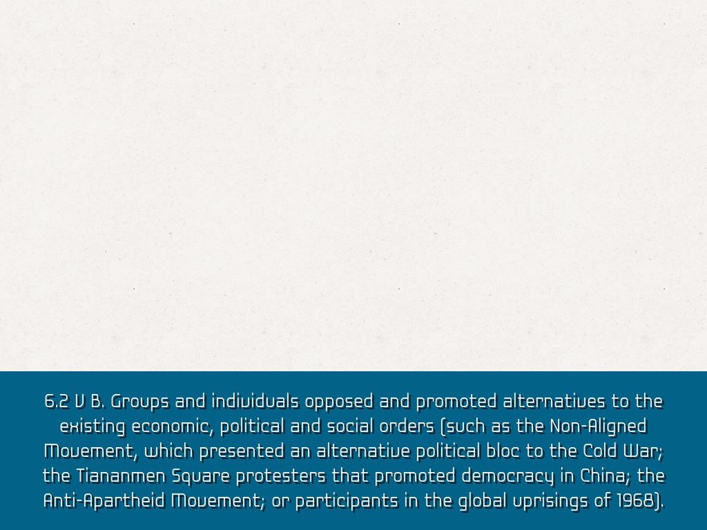 6.2 V B. Groups and individuals opposed and promoted alternatives to the existing economic, political and social orders (such as the Non-Aligned Movement, which presented an alternative political bloc to the Cold War; the Tiananmen Square protesters that promoted democracy in China; the Anti-Apartheid Movement; or participants in the global uprisings of 1968).