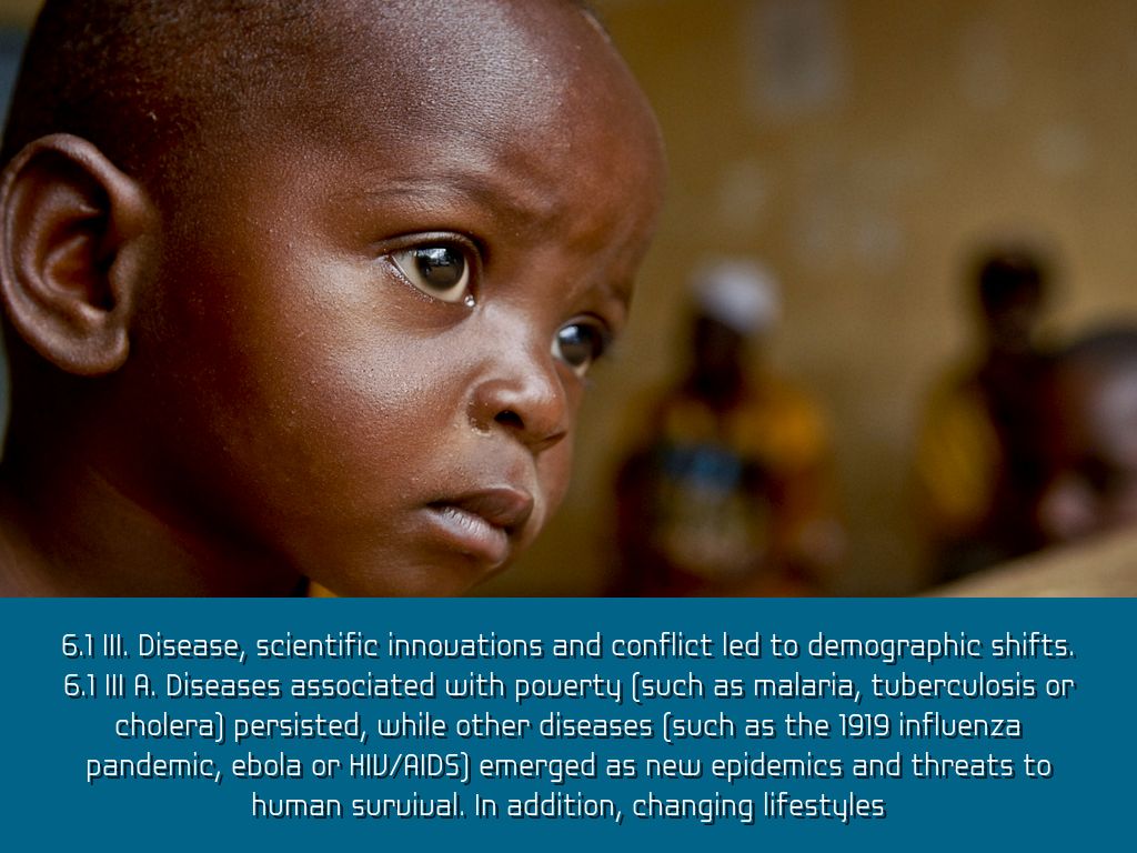 6.1 III A. Diseases associated with poverty (such as malaria, tuberculosis or cholera) persisted, while other diseases (such as the 1919 influenza pandemic, ebola or HIV/AIDS) emerged as new epidemics and threats to human survival. In addition, changing lifestyles