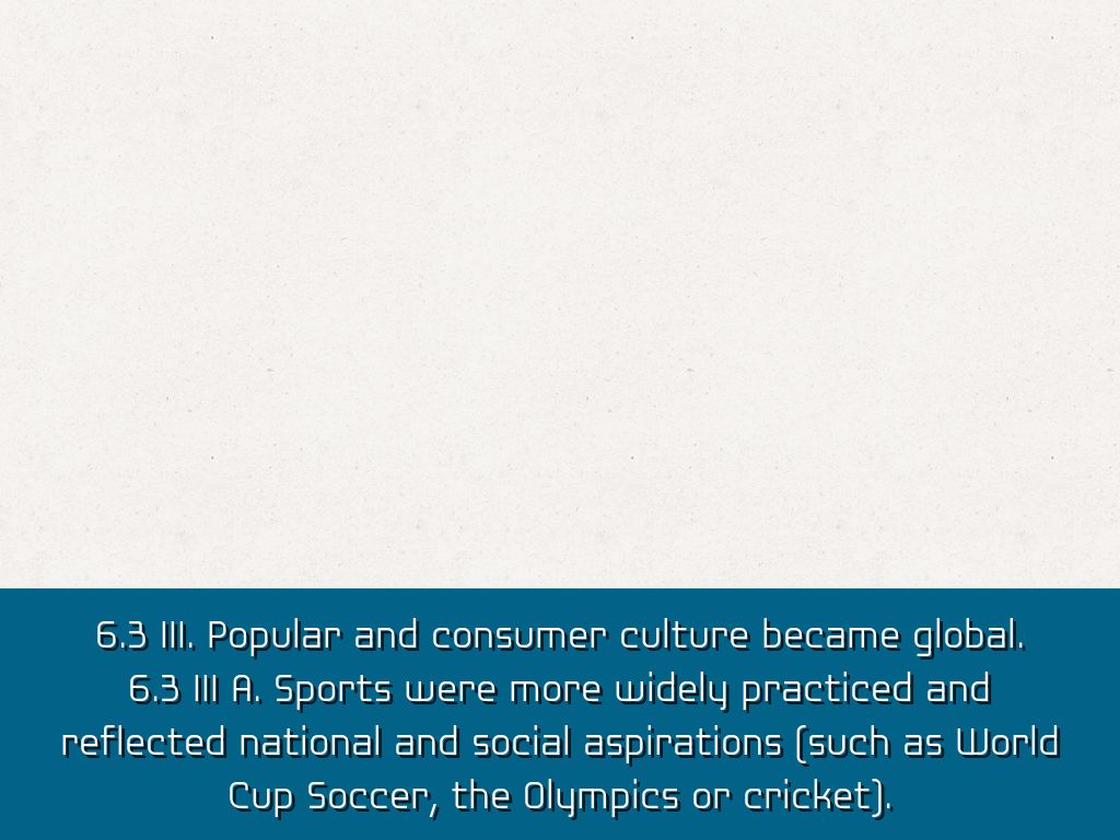 6.3 III A. Sports were more widely practiced and reflected national and social aspirations (such as World Cup Soccer, the Olympics or cricket).