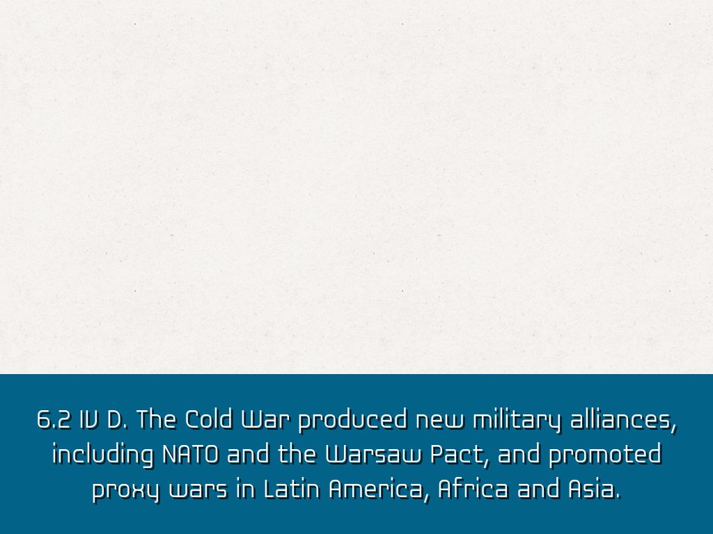 6.2 IV D. The Cold War produced new military alliances, including NATO and the Warsaw Pact, and promoted proxy wars in Latin America, Africa and Asia.