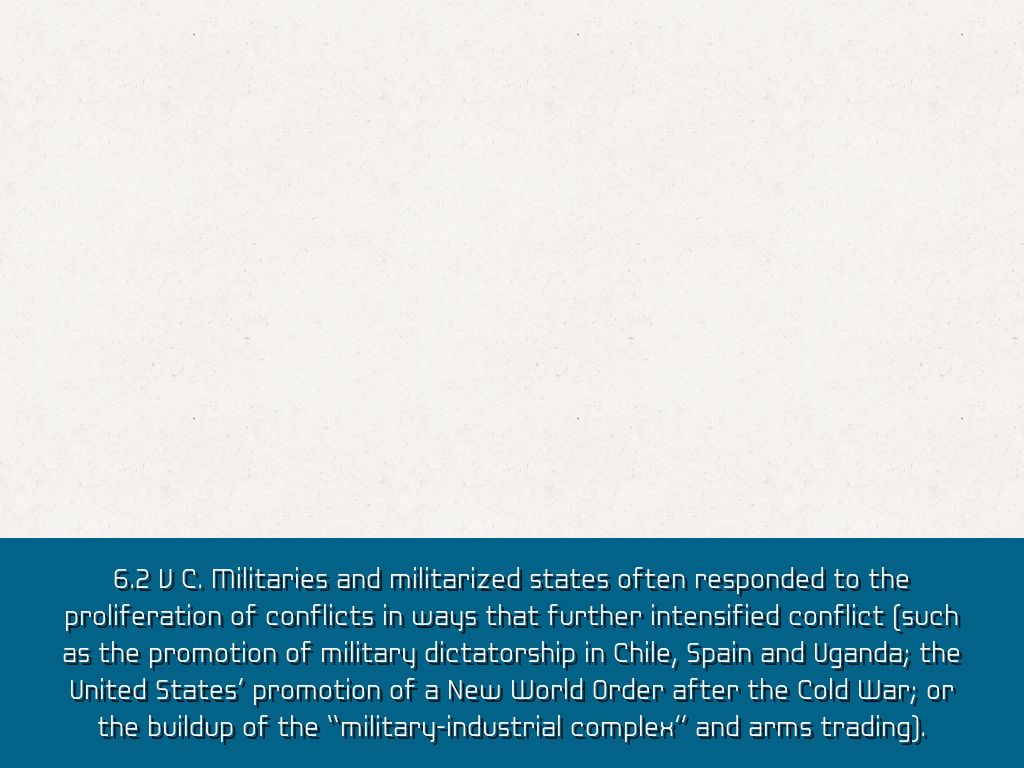 6.2 V C. Militaries and militarized states often responded to the proliferation of conflicts in ways that further intensified conflict (such as the promotion of military dictatorship in Chile, Spain and Uganda; the United States’ promotion of a New World Order after the Cold War; or the buildup of the “military-industrial complex” and arms trading).
