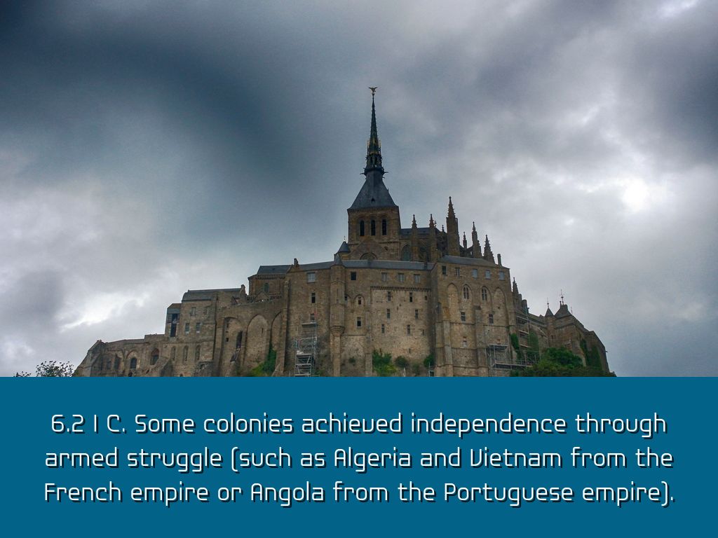 6.2 I C. Some colonies achieved independence through armed struggle (such as Algeria and Vietnam from the French empire or Angola from the Portuguese empire).