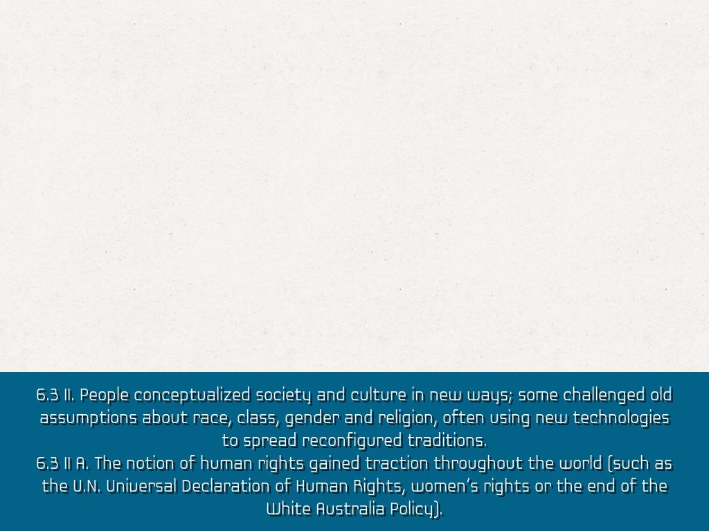 6.3 II A. The notion of human rights gained traction throughout the world (such as the U.N. Universal Declaration of Human Rights, women’s rights or the end of the White Australia Policy).