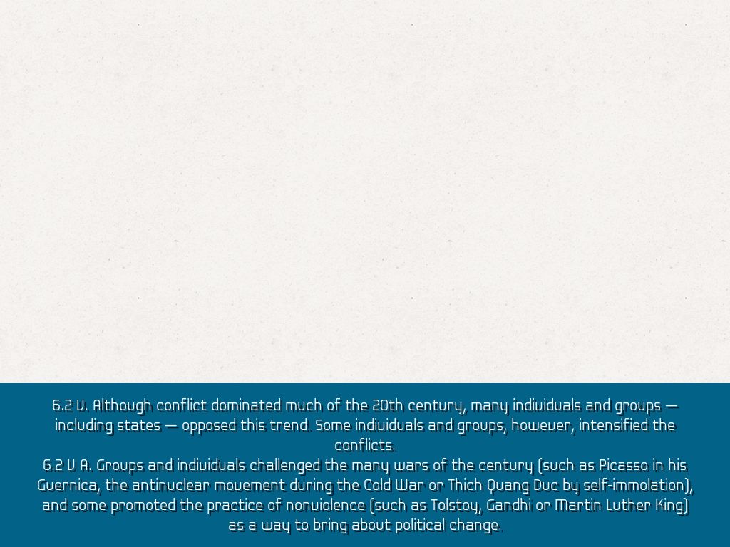 6.2 V A. Groups and individuals challenged the many wars of the century (such as Picasso in his Guernica, the antinuclear movement during the Cold War or Thich Quang Duc by self-immolation), and some promoted the practice of nonviolence (such as Tolstoy, Gandhi or Martin Luther King) as a way to bring about political change.