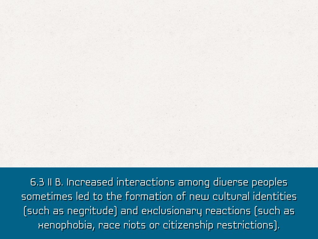 6.3 II B. Increased interactions among diverse peoples sometimes led to the formation of new cultural identities (such as negritude) and exclusionary reactions (such as xenophobia, race riots or citizenship restrictions).