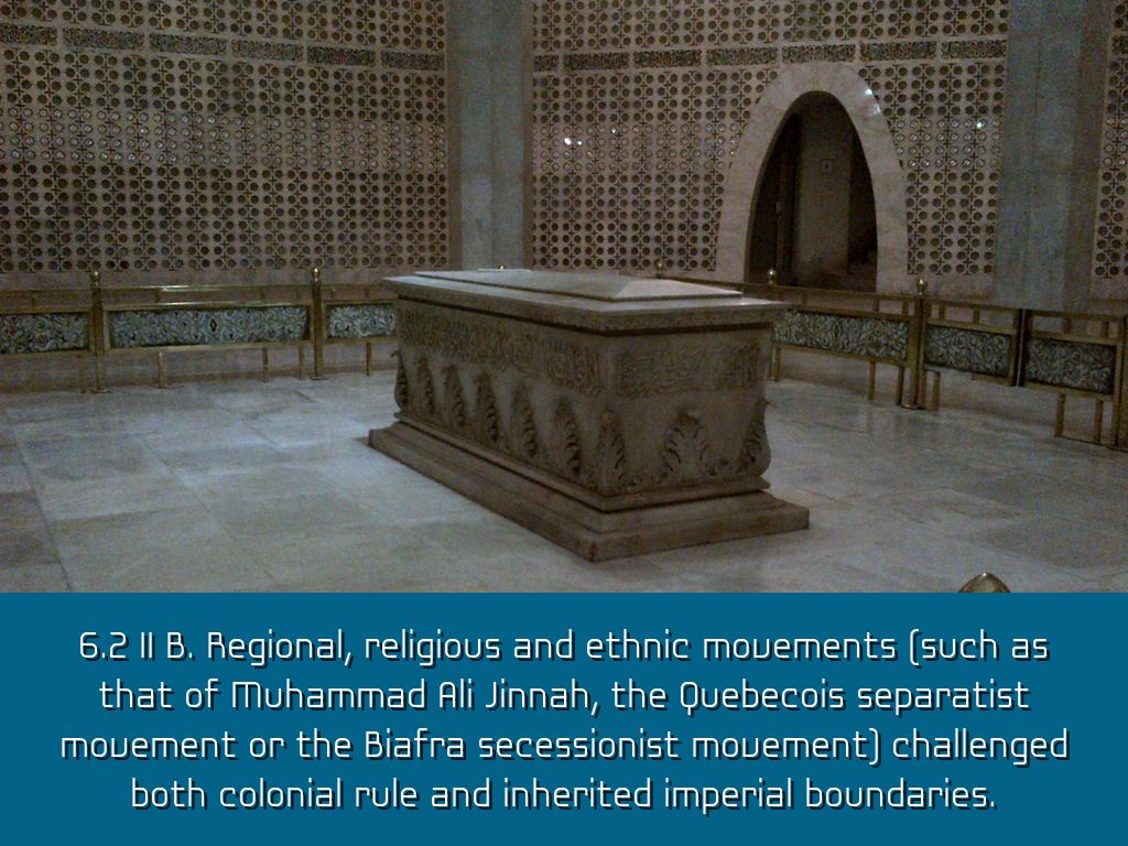 6.2 II B. Regional, religious and ethnic movements (such as that of Muhammad Ali Jinnah, the Quebecois separatist movement or the Biafra secessionist movement) challenged both colonial rule and inherited imperial boundaries.