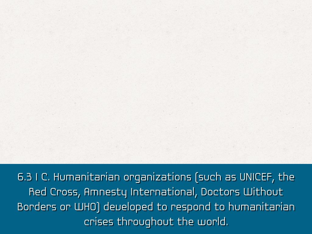 6.3 I C. Humanitarian organizations (such as UNICEF, the Red Cross, Amnesty International, Doctors Without Borders or WHO) developed to respond to humanitarian crises throughout the world.