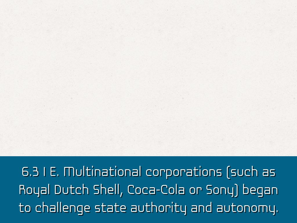 6.3 I E. Multinational corporations (such as Royal Dutch Shell, Coca-Cola or Sony) began to challenge state authority and autonomy.