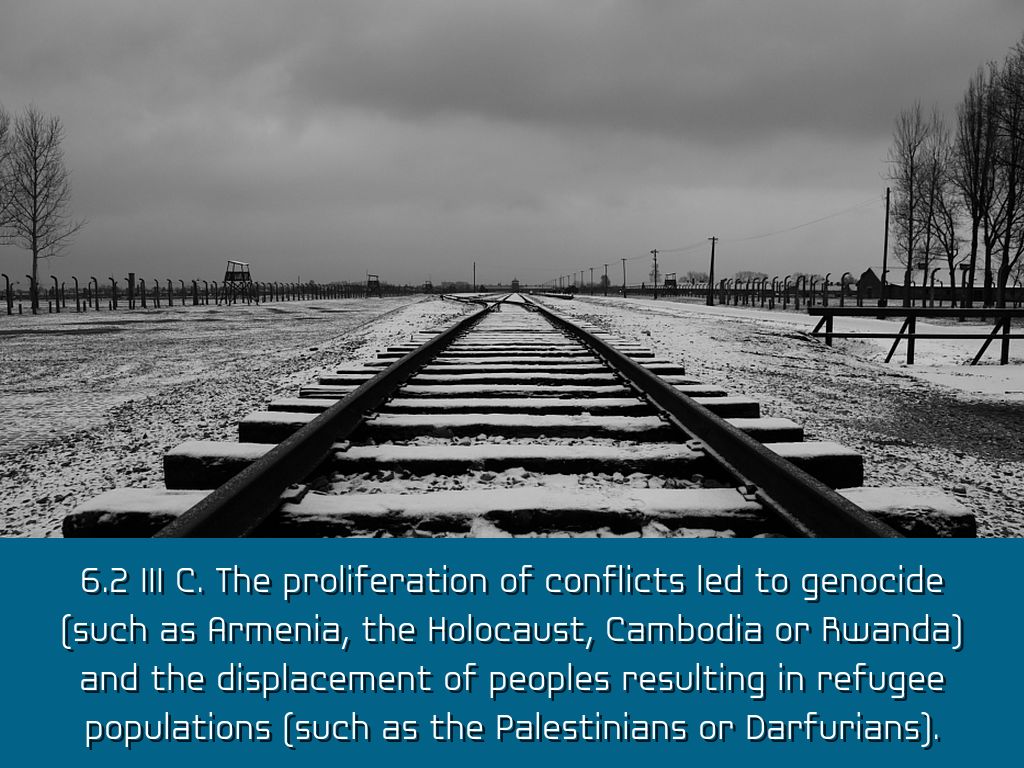 6.2 III C. The proliferation of conflicts led to genocide (such as Armenia, the Holocaust, Cambodia or Rwanda) and the displacement of peoples resulting in refugee populations (such as the Palestinians or Darfurians).