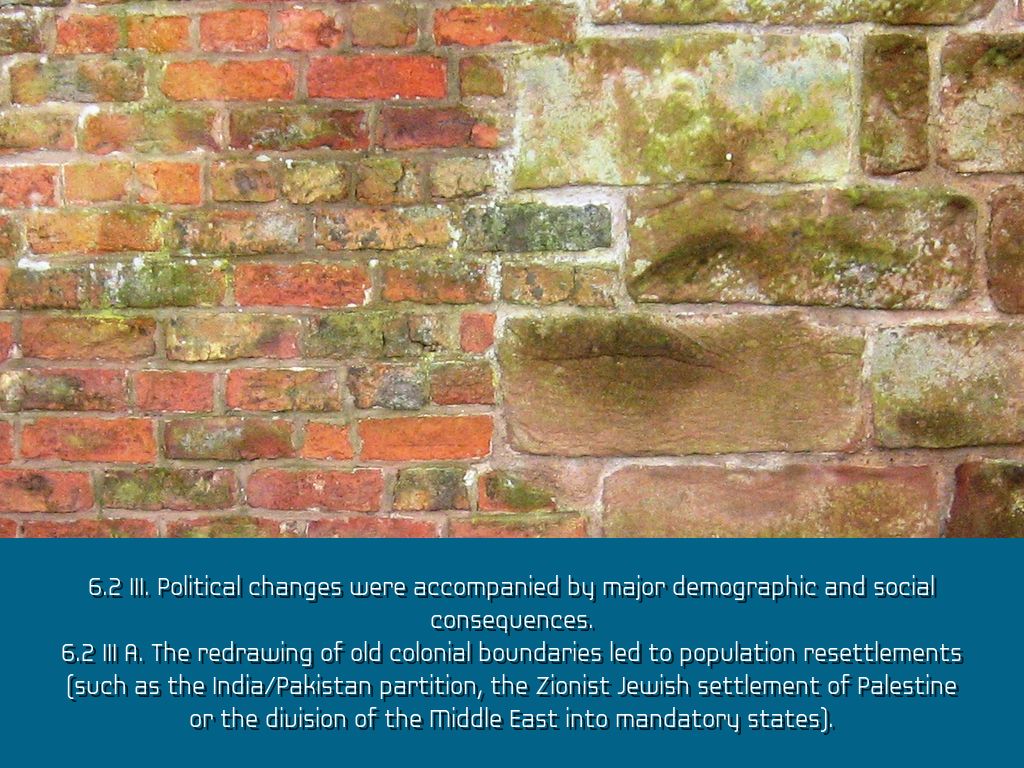 6.2 III A. The redrawing of old colonial boundaries led to population resettlements (such as the India/Pakistan partition, the Zionist Jewish settlement of Palestine or the division of the Middle East into mandatory states).