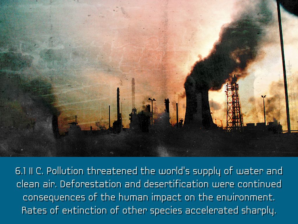 6.1 II C. Pollution threatened the world's supply of water and clean air. Deforestation and desertification were continued consequences of the human impact on the environment. Rates of extinction of other species accelerated sharply.
