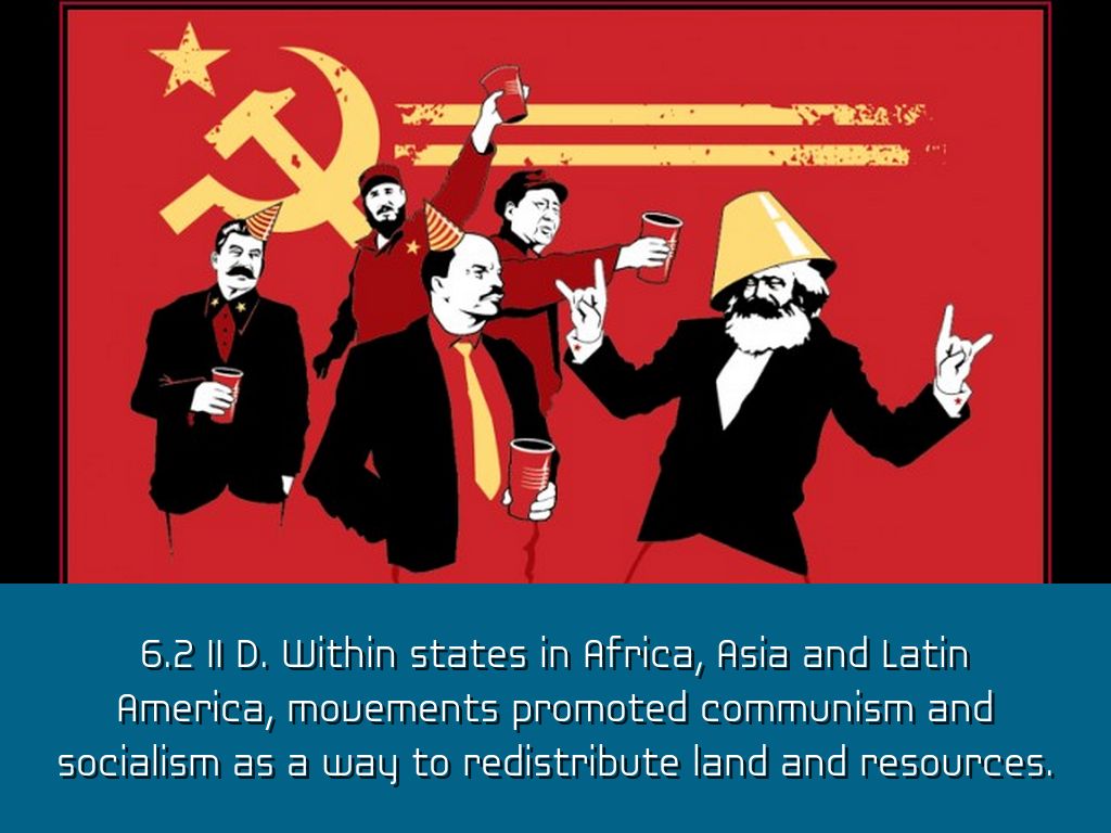 6.2 II D. Within states in Africa, Asia and Latin America, movements promoted communism and socialism as a way to redistribute land and resources.