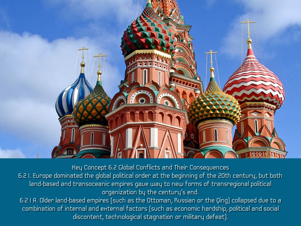 6.2 I A. Older land-based empires (such as the Ottoman, Russian or the Qing) collapsed due to a combination of internal and external factors (such as economic hardship, political and social discontent, technological stagnation or military defeat).