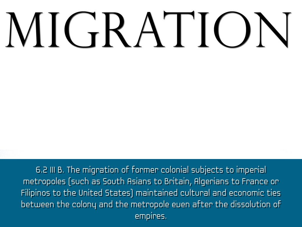 6.2 III B. The migration of former colonial subjects to imperial metropoles (such as South Asians to Britain, Algerians to France or Filipinos to the United States) maintained cultural and economic ties between the colony and the metropole even after the dissolution of empires.