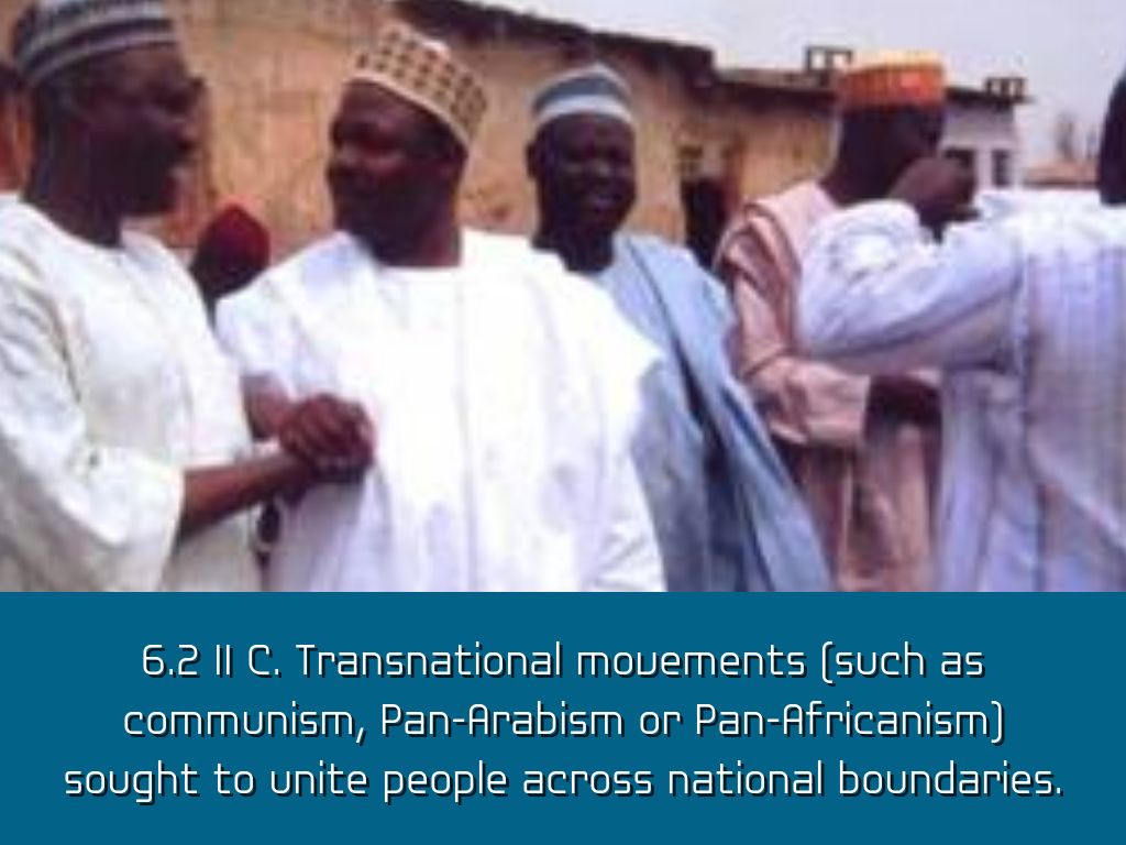 6.2 II C. Transnational movements (such as communism, Pan-Arabism or Pan-Africanism) sought to unite people across national boundaries.