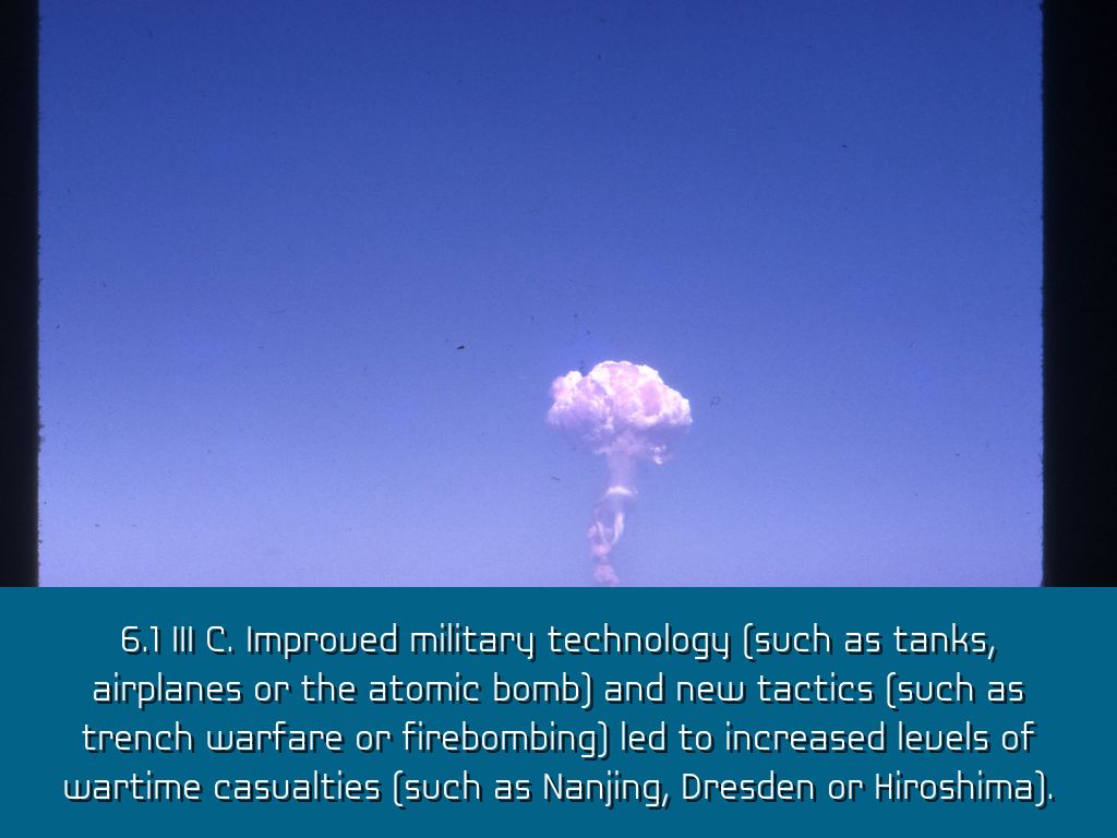 6.1 III C. Improved military technology (such as tanks, airplanes or the atomic bomb) and new tactics (such as trench warfare or firebombing) led to increased levels of wartime casualties (such as Nanjing, Dresden or Hiroshima).