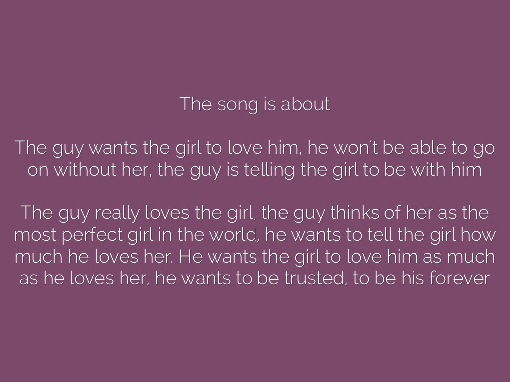 The guy really loves the girl, the guy thinks of her as the most perfect girl in the world, he wants to tell the girl how much he loves her. He wants the girl to love him as much as he loves her, he wants to be trusted, to be his forever