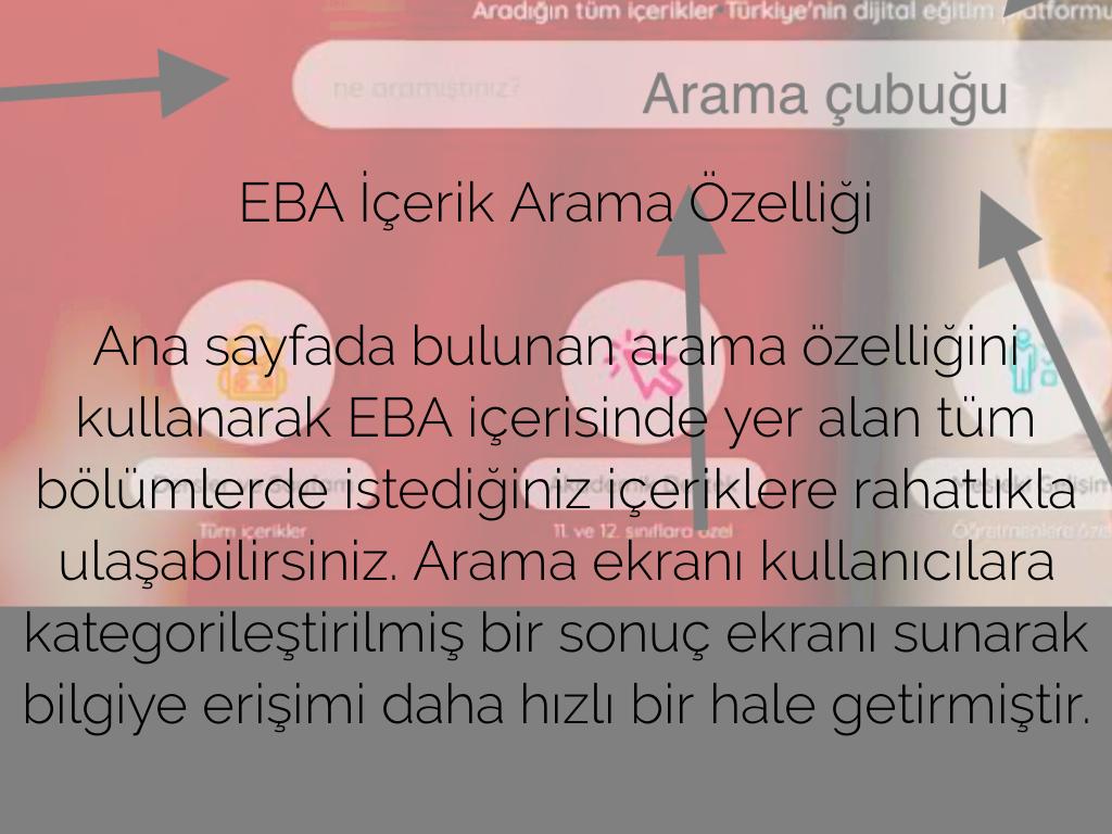 Ana sayfada bulunan arama özelliğini kullanarak EBA içerisinde yer alan tüm bölümlerde istediğiniz içeriklere rahatlıkla ulaşabilirsiniz. Arama ekranı kullanıcılara kategorileştirilmiş bir sonuç ekranı sunarak bilgiye erişimi daha hızlı bir hale getirmiştir.