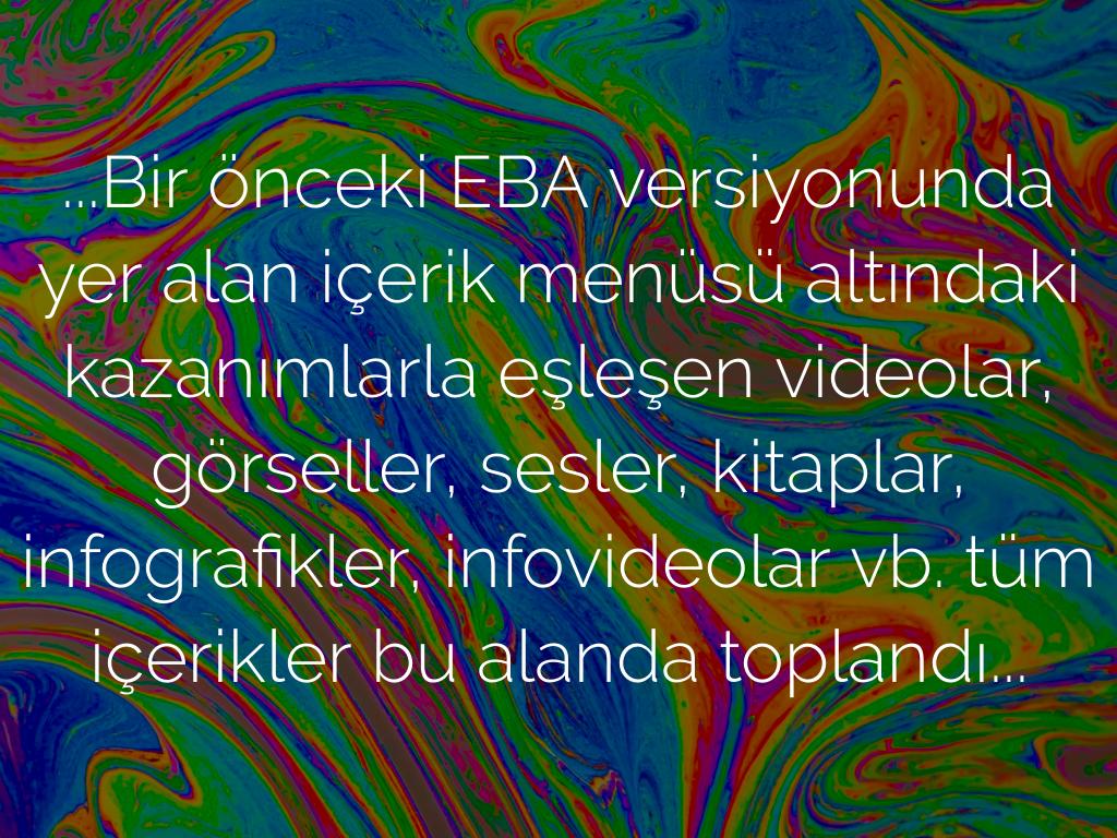 ...Bir önceki EBA versiyonunda yer alan içerik menüsü altındaki kazanımlarla eşleşen videolar, görseller, sesler, kitaplar, infografikler, infovideolar vb. tüm içerikler bu alanda toplandı...