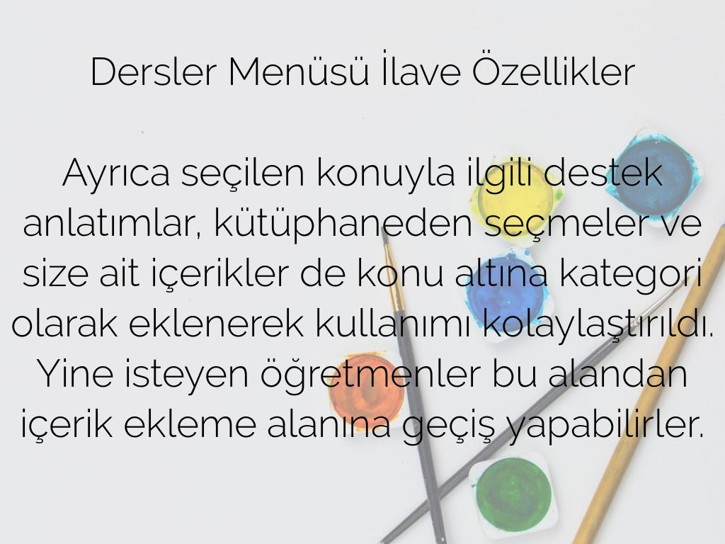 Ayrıca seçilen konuyla ilgili destek anlatımlar, kütüphaneden seçmeler ve size ait içerikler de konu altına kategori olarak eklenerek kullanımı kolaylaştırıldı. Yine isteyen öğretmenler bu alandan içerik ekleme alanına geçiş yapabilirler.