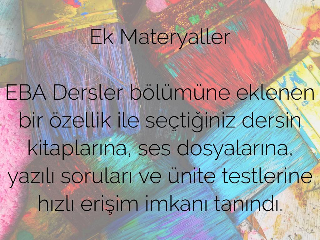 EBA Dersler bölümüne eklenen bir özellik ile seçtiğiniz dersin kitaplarına, ses dosyalarına, yazılı soruları ve ünite testlerine hızlı erişim imkanı tanındı.