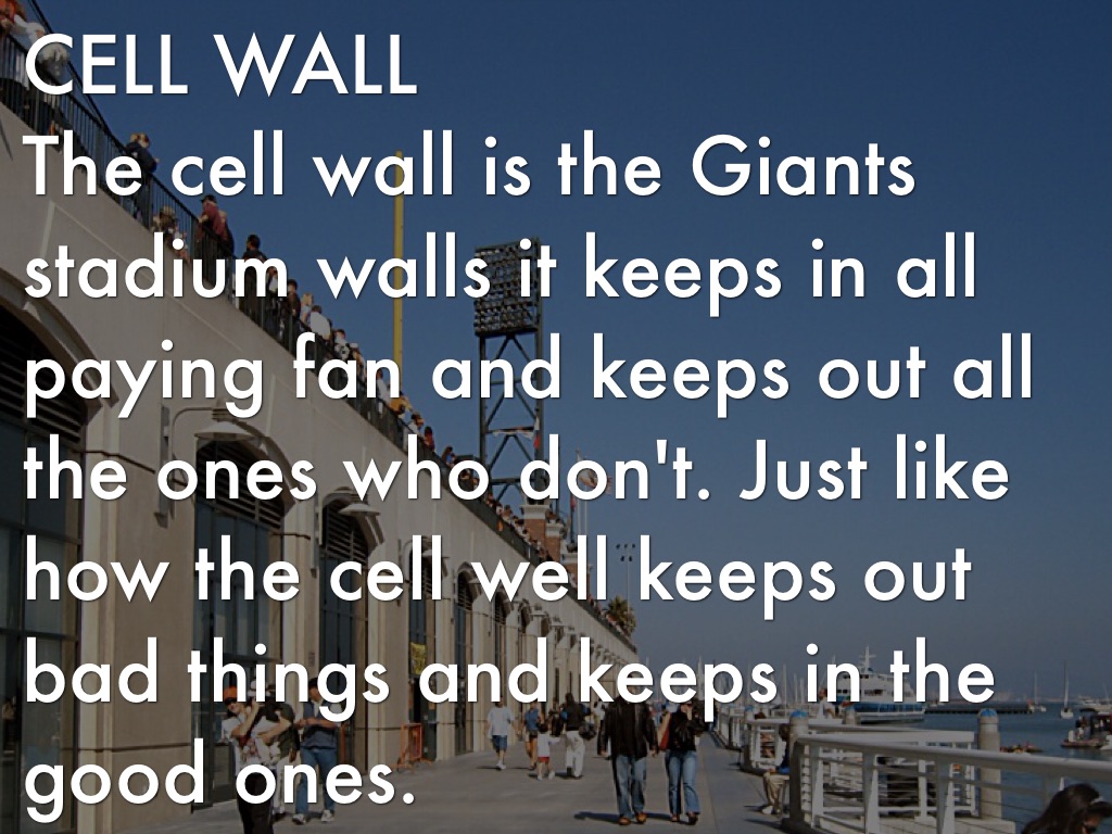 The cell wall is the Giants stadium walls it keeps in all paying fan and keeps out all the ones who don't. Just like how the cell well keeps out bad things and keeps in the good ones.