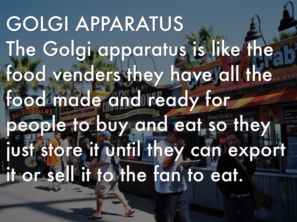 The Golgi apparatus is like the food venders they have all the food made and ready for people to buy and eat so they just store it until they can export it or sell it to the fan to eat.