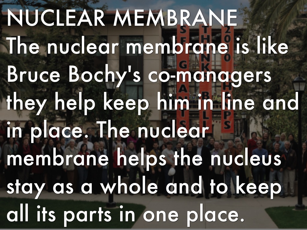 The nuclear membrane is like Bruce Bochy's co-managers they help keep him in line and in place. The nuclear membrane helps the nucleus stay as a whole and to keep all its parts in one place.