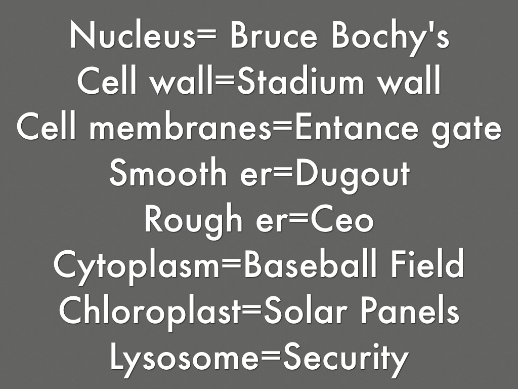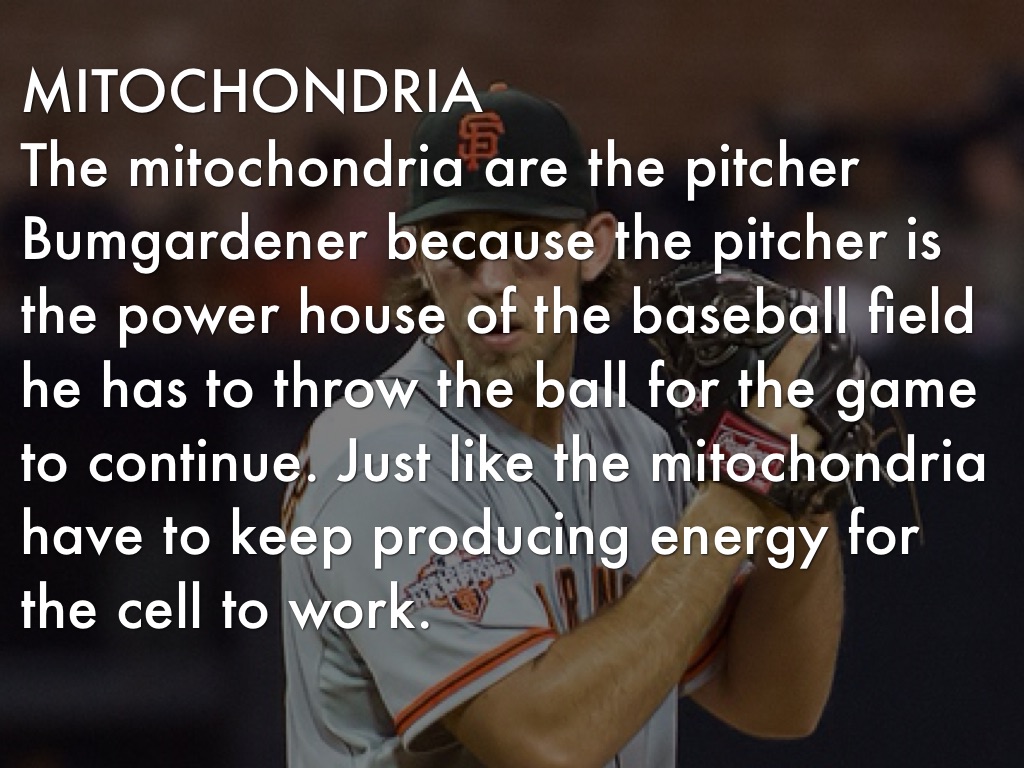 The mitochondria are the pitcher Bumgardener because the pitcher is the power house of the baseball field he has to throw the ball for the game to continue. Just like the mitochondria have to keep producing energy for the cell to work.