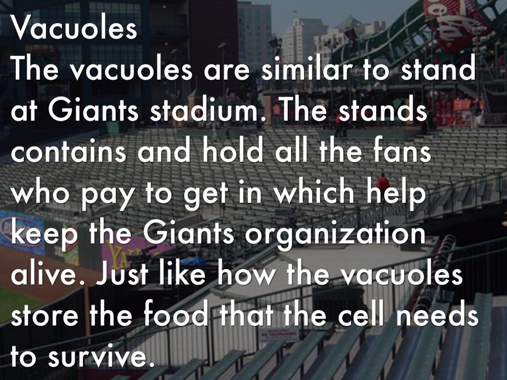 The vacuoles are similar to stand at Giants stadium. The stands contains and hold all the fans who pay to get in which help keep the Giants organization alive. Just like how the vacuoles store the food that the cell needs to survive.