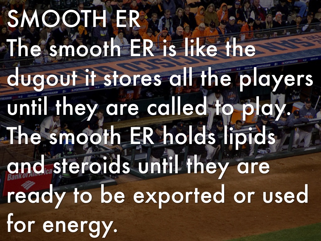 The smooth ER is like the dugout it stores all the players until they are called to play. The smooth ER holds lipids and steroids until they are ready to be exported or used for energy.