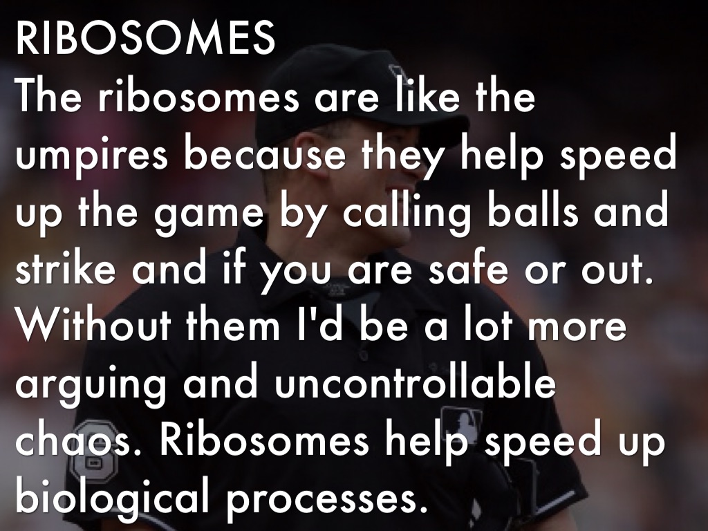 The ribosomes are like the umpires because they help speed up the game by calling balls and strike and if you are safe or out. Without them I'd be a lot more arguing and uncontrollable chaos. Ribosomes help speed up biological processes.