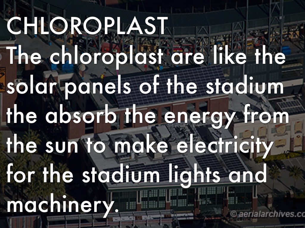 The chloroplast are like the solar panels of the stadium the absorb the energy from the sun to make electricity for the stadium lights and machinery.