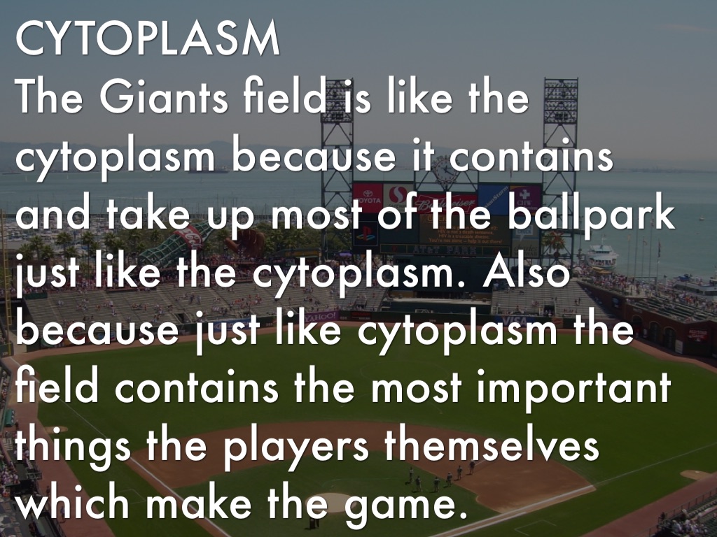 The Giants field is like the cytoplasm because it contains and take up most of the ballpark just like the cytoplasm. Also because just like cytoplasm the field contains the most important things the players themselves which make the game.