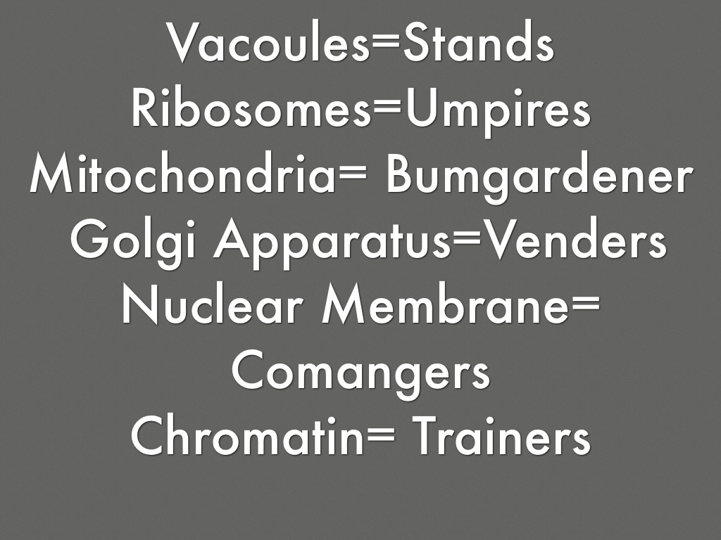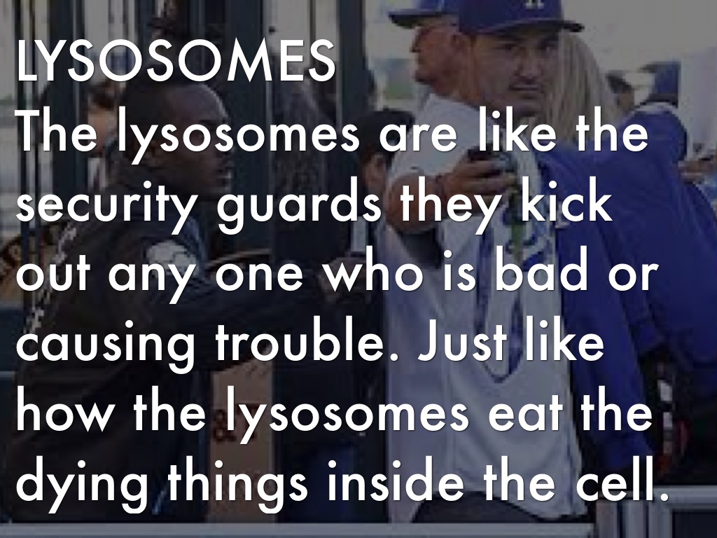 The lysosomes are like the security guards they kick out any one who is bad or causing trouble. Just like how the lysosomes eat the dying things inside the cell.