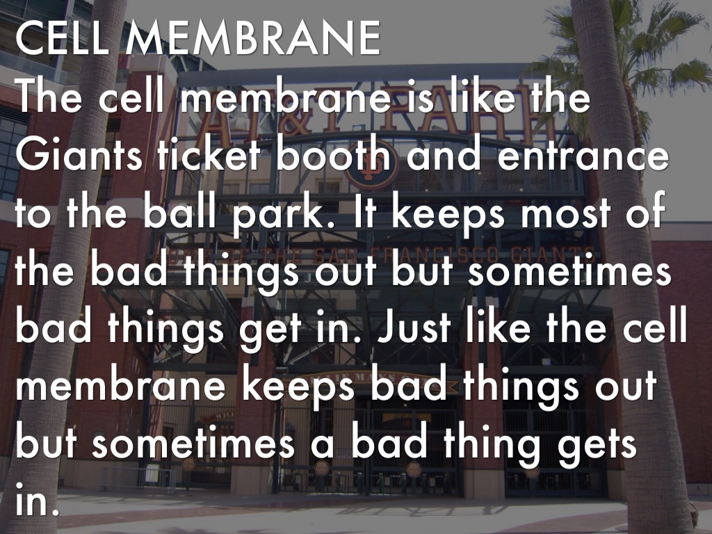 The cell membrane is like the Giants ticket booth and entrance to the ball park. It keeps most of the bad things out but sometimes bad things get in. Just like the cell membrane keeps bad things out but sometimes a bad thing gets in.